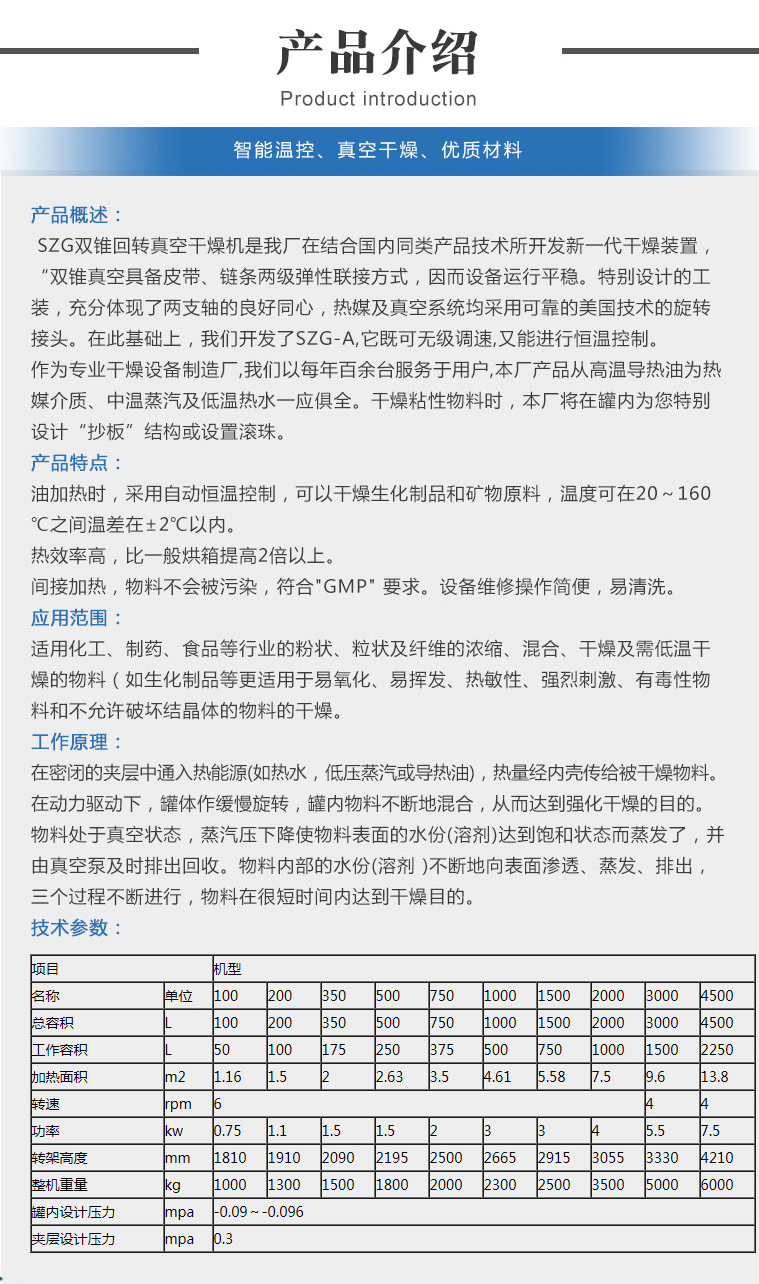 雙錐真空干燥機(jī)是我廠在結(jié)合國內(nèi)同類產(chǎn)品技術(shù)所開發(fā)新一代干燥裝置,“雙錐真空具備皮帶、鏈條兩級(jí)彈性聯(lián)接方式,因而設(shè)備運(yùn)行平穩(wěn)。特別設(shè)計(jì)的工裝,充分體現(xiàn)了兩支軸的良好同心,熱媒及真空系統(tǒng)均采用可靠的美國技術(shù)的旋轉(zhuǎn)接頭。在此基礎(chǔ)上,我們開發(fā)了SZG-A,它既可無級(jí)調(diào)速,又能進(jìn)行恒溫控制。